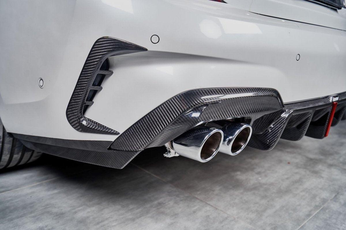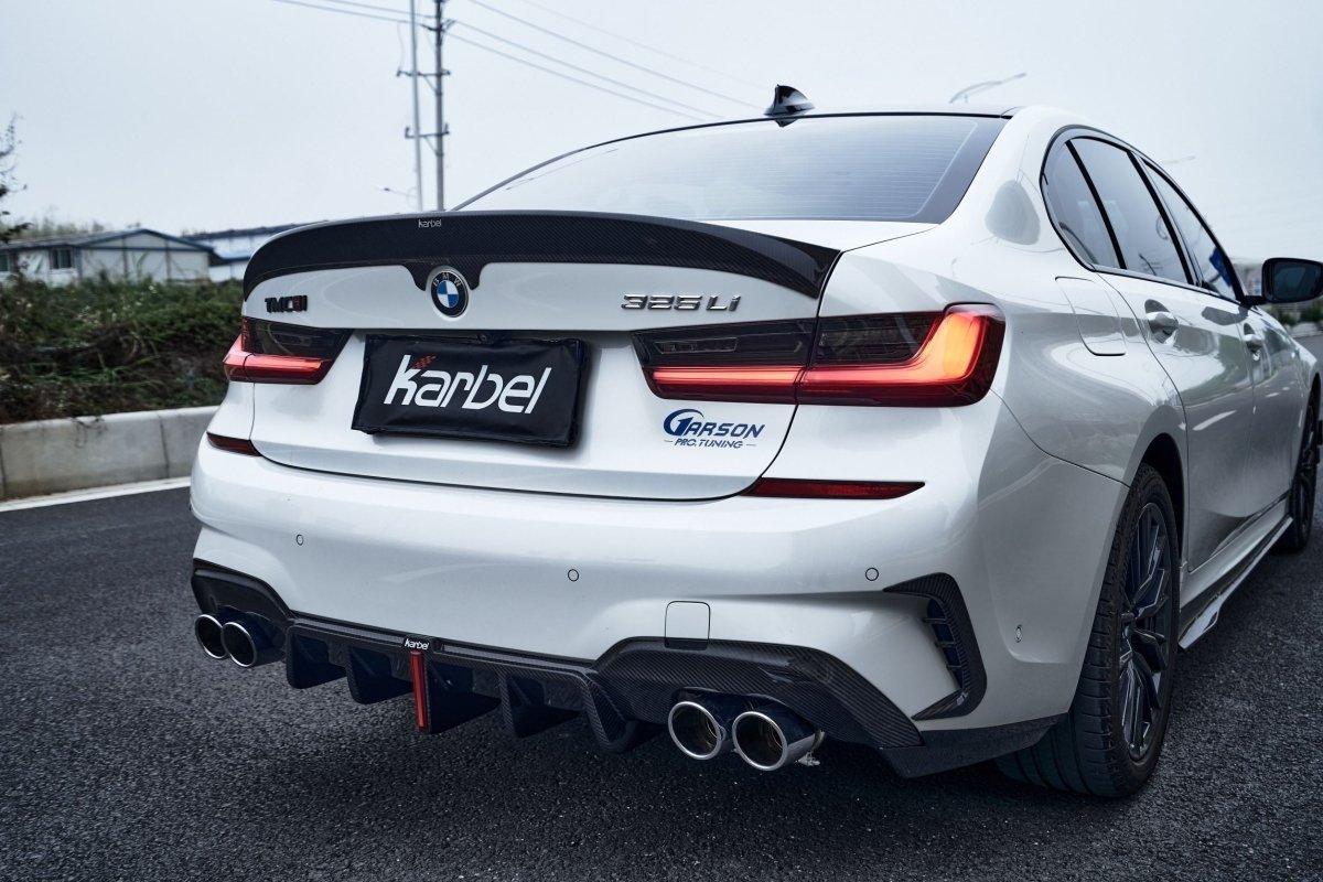 Upgrade Your BMW 3 Series 330i (with M-package bumper, does not fit base model) M340i G20 G21 Pre-LCI 2019-2022 with Aftermarket Parts - Rear Bumper Canards Pre-preg Carbon Fiber from Karbel Carbon