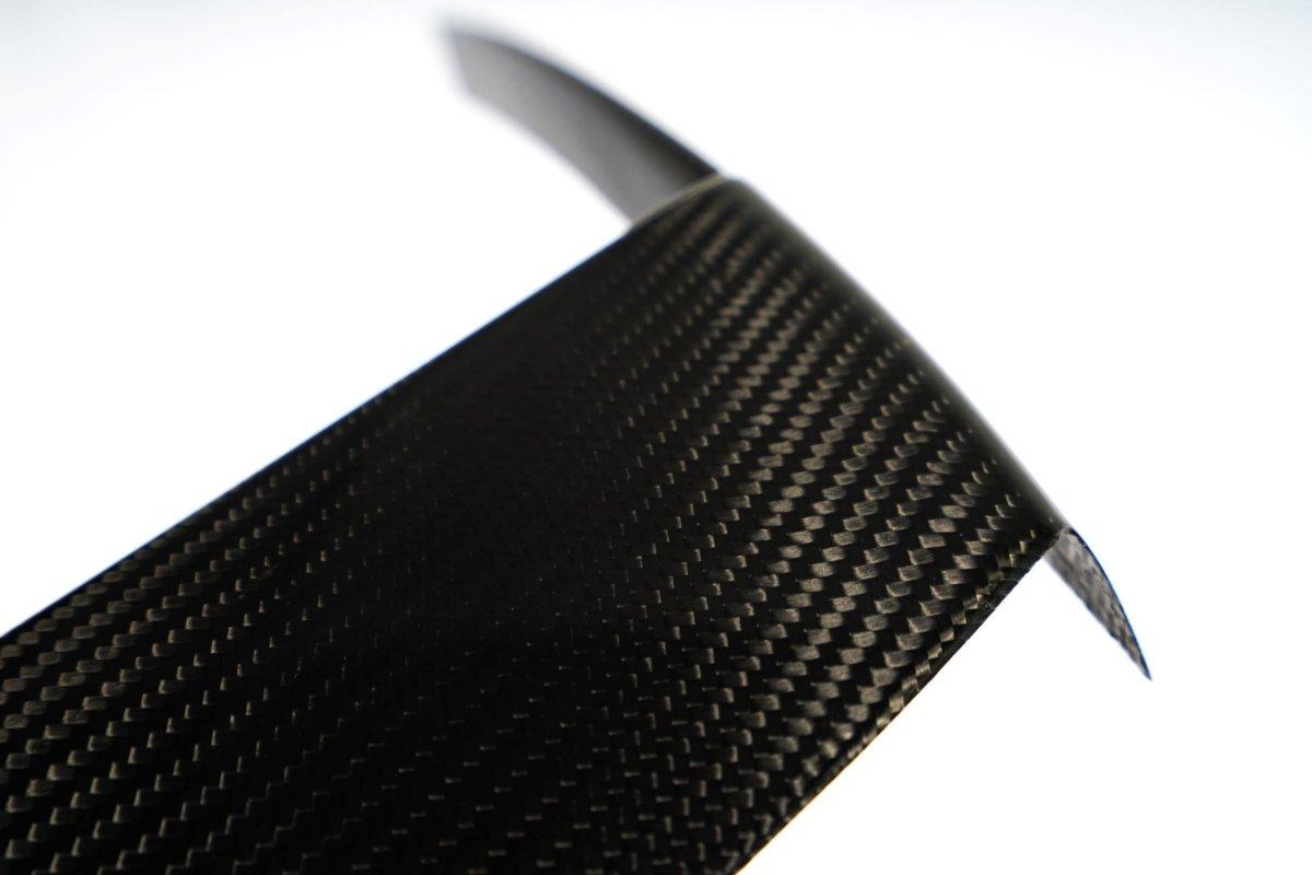 Our products are made of dry carbon fiber, which is third generation of carbon fiber material characterized by its lightweight and strength. The dry carbon fiber fabric is weaved with resin pre-impregnated carbon fiber called "Pre-preg" in carbon fiber industry. Pre-preg reaches optimal resin/carbon ratio to strive for its characteristics. Thus during the carbon parts manufacture process, there is no resin application needed when molding. This is why we call it “Dry” carbon fiber. Autoclave process is another important step to finish our product. In the autoclave, the high pressure and temperature are the key to our products’ tensile strength, which could be 15 times higher than steel's. Unlike the Wet carbon fiber where the resin is applied into carbon fiber cloth to form sturdy structure, dry carbon fiber parts are generally 50% lighter than those made of wet carbon fiber, and the strength of these two materials are also different. That is why carbon inlays and interiors use wet carbon fiber.